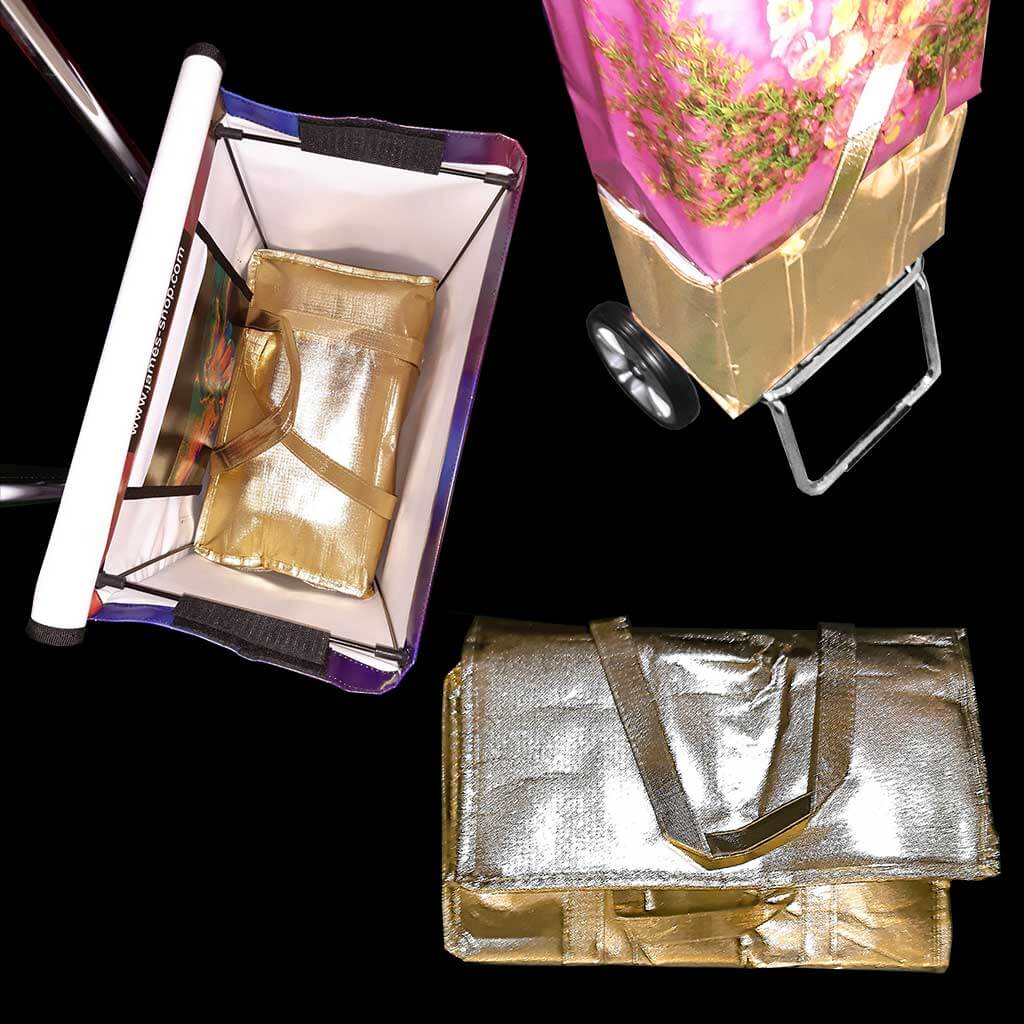 Die doppelt "coole" Kühlbox passt bei Bedarf genau 2 x übereinander in einen James hinein, oder auch 1 x solo zwischen James-Box und Gestellboden. Sie fasst zb. 6 Petflaschen à 1,5lt (also 9lt), oder 20 Bierdosen à 0,5lt, oder ca. 30 Eis-Cornettis etc.; Sie ist aussen aus edel blassgoldenem PP Nonwoven Material und innen mit Thermofolie ausgestattet, lässt sich mit einem Reissverschluss schliessen und flach zusammenfalten.