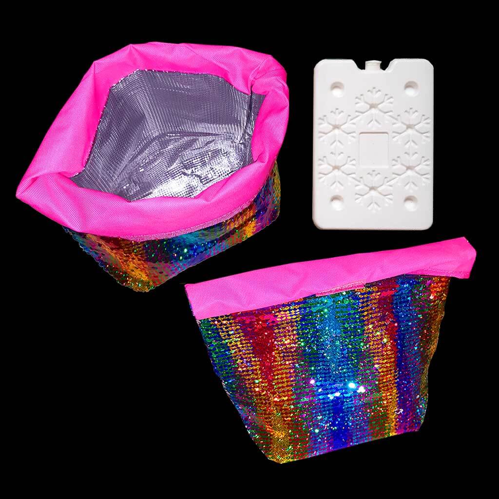 Der glitzernde Lunch-Bag im Rainbow-Pailletten-Look ist die perfekte Pausenbrot- und Picknicktasche für Unterwegs, Kindergarten, Schule, Uni, Büro, Schwimmbad, Ausflug... Es passen wunderbar hinein ein 0,5lt Flasche oder Dose, ein paar Sandwiches oder eine Tupperwarebox, und oben offen sogar 2 Sektflaschen für ein Geburtstagsfest... Schillernde Wendepailletten, innen Thermofolie, Rollverschluss mit Klett. Lieferumfang: 1 Rainbow-Bag, optional mit 1 Kühl-Akku (Farbe rot, orange oder weiss, nicht wählbar) und - besonders beliebt für Kinder: 1 Umhängekette (ca. 100cm) mit Minikarabinern (in gold oder silber, nicht wählbar).