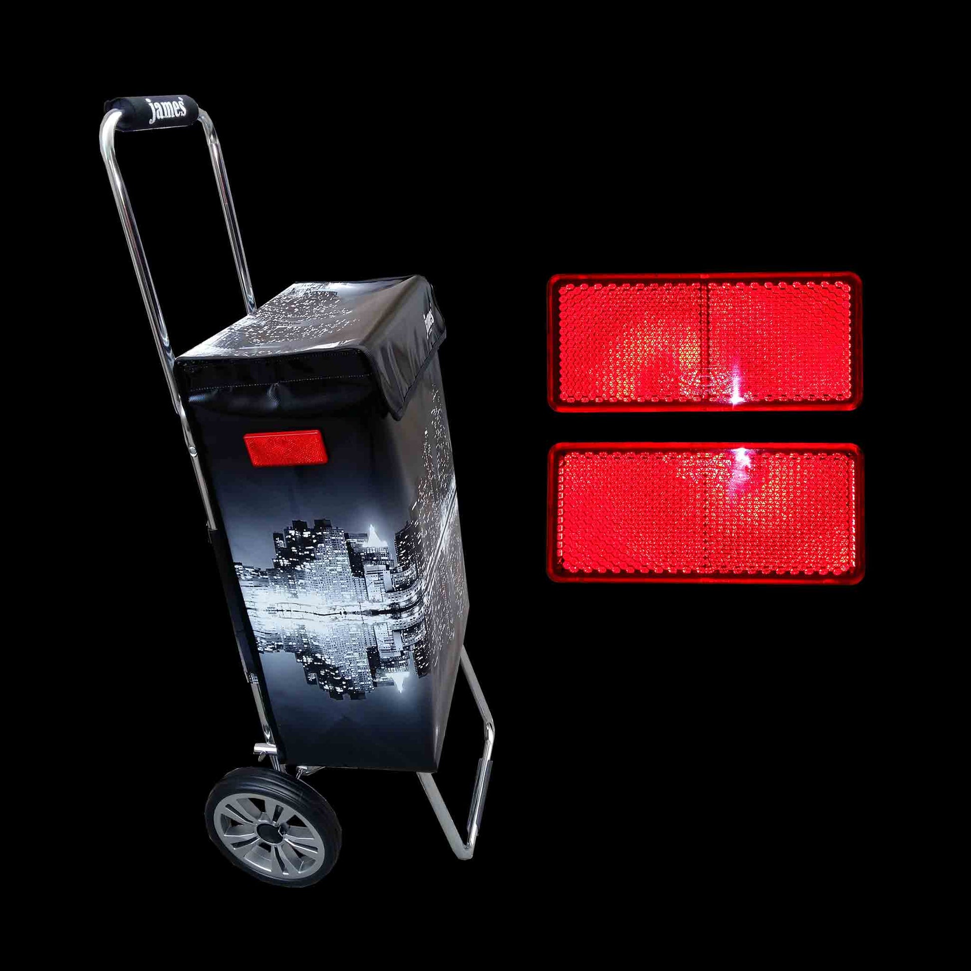 Die Reflektoren können z.B. seitlich oder auf der Frontfläche vom James angebracht werden. Sie erhöhen die Sichtbarkeit im Strassenverkehr bei Dämmerlicht oder bei Nacht.