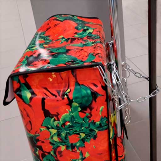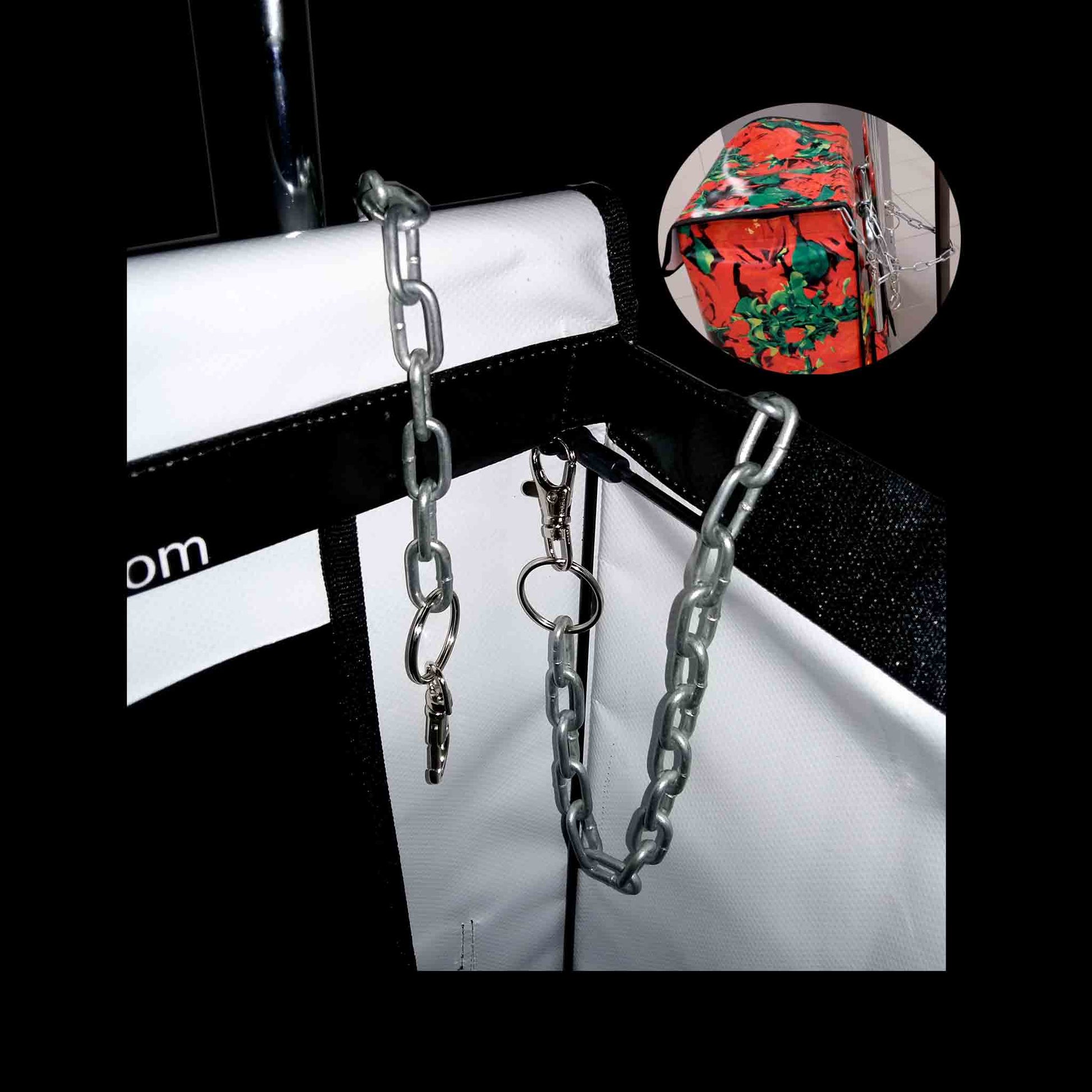 Sicherungskette mit kleinem Schloss, damit du deinen James zb. im Supermarkt anketten und vor schnellen Diebstählen sichern kannst. Dazu bekommst du noch 4 kleine Karabiner mit Klemmringen, damit du Schlüsselbund, Einkaufswagen-Jeton, Etuis etc. anhängen kannst. Die Kette ist 75cm lang und aus geschweissten Eisenelementen.
